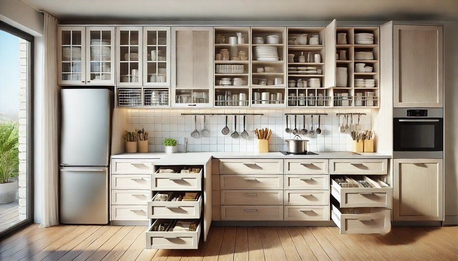 Besonders praktisch sind Auszugssysteme in den Unterschränken. Diese bieten viel Stauraum für größere Küchenutensilien wie Töpfe und Pfannen. die oft schwierig zu organisieren sind. Ein gut durchdachtes Auszugsystem sorgt dafür, dass auch diese Utensilien, die schwer zu organisieren sind, leicht erreichbar sind.