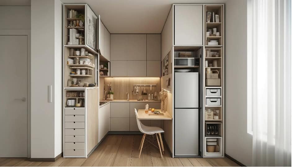 In kleinen Küchen sind raumsparende Lösungen besonders gefragt. Vertikale Lagerungssysteme und versteckte Module maximieren den Raum, ohne die Ästhetik zu beeinträchtigen. Multifunktionale Wandpaneele können als Stauraum, Arbeitsfläche und sogar als Esstisch dienen.